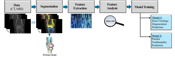 This study is part of an EU-funded project called P4-FIT, whose aim is innovation in tendon repair. The main objective of this study was to understand the interplay between knee cartilage, quadriceps muscle, quadriceps tendon, and patellar tendon. The dataset of another European Union project called RESTORE was used to access the CT and MRI scans of patients with knee cartilage degeneration. To gain a better understanding of the interaction between cartilage, quadriceps, and patellar tendons, several sets of features were extracted in five different categories, namely Gray-level co-occurrence matrix, Amount of fat and water containing tissues present in quadriceps and patellar tendons, Tendon thickness, Profile line analysis and Radiodensity (HU). For feature extraction, quadriceps and patellar tendons were used as the regions of interest (ROIs). Using different sets and combination of these features, different classifiers were trained to perform two distinct classification tasks. The first classifier determined whether there was degeneration of the knee cartilage, while the second one determined whether the patellar tendons were tendinopathic. To predict cartilage degeneration, some of the most important features were age, the total number of patellar tendon-containing pixels, the number of quadriceps and patellar tendon pixels containing water, etc. Using these features, our best classifier model achieved an accuracy of 89.4% for cartilage degeneration prediction. Whereas the fat-containing pixels of quadriceps and patellar tendons were two of the significant features in predicting patellar tendon involvement in tendinopathic processes. Only the sets of important features were used to obtain the best result for predicting patellar tendinopathy, which resulted in an accuracy of 83%. To our best knowledge, this is the first study to show that even without using any information about the knee bone and cartilage themselves, quadriceps and patellar tendons alone may play a powerful role in predicting knee cartilage degeneration and patellar tendinopathy. Throughout our investigation, we also found that the total amount of water and fatty tissue in the quadriceps and patellar tendons plays an important role in predicting such outcomes.